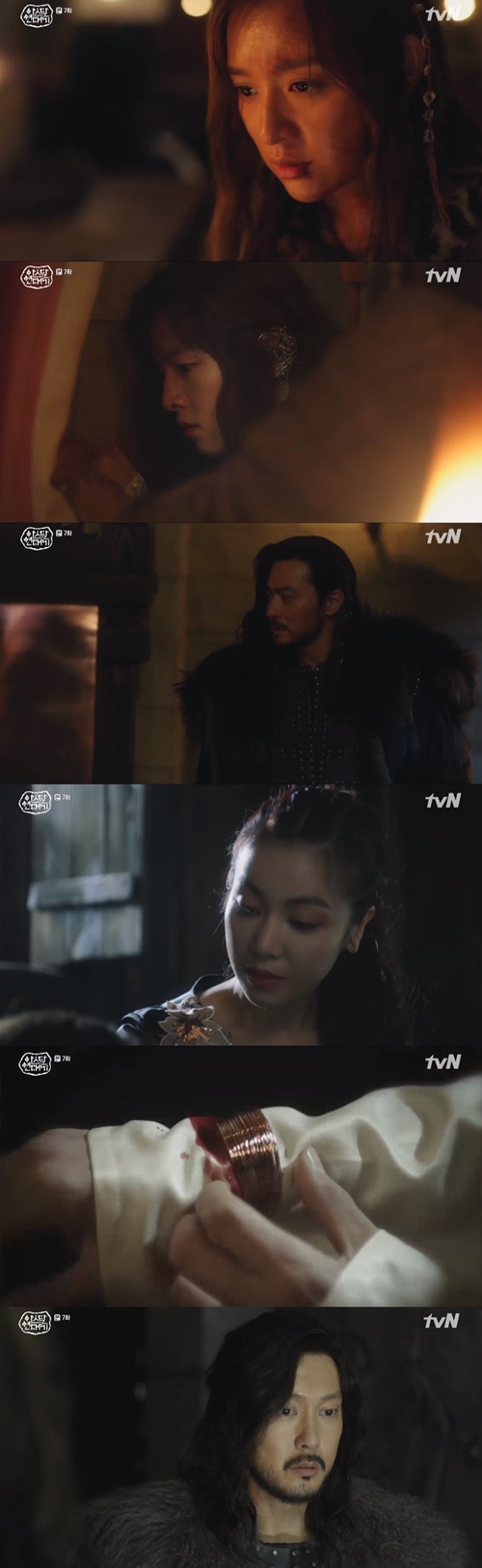 22일 오후 방송된 tvN 주말드라마 '아스달 연대기'에서는 사야(송중기 분)가 태알하(김옥빈 분)에게 복수한 장면이 그려졌다.