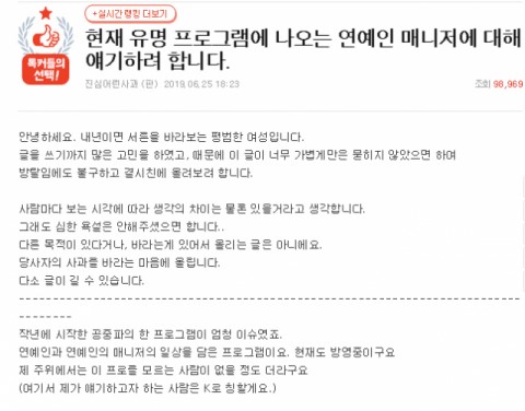 앞서 지난 25일 한 온라인 커뮤니티에는 '현재 유명 프로그램에 나오는 연예인 매니저에 대해 얘기하려 한다'는 제목의 폭로글이 게재되며 관심을 모았다.