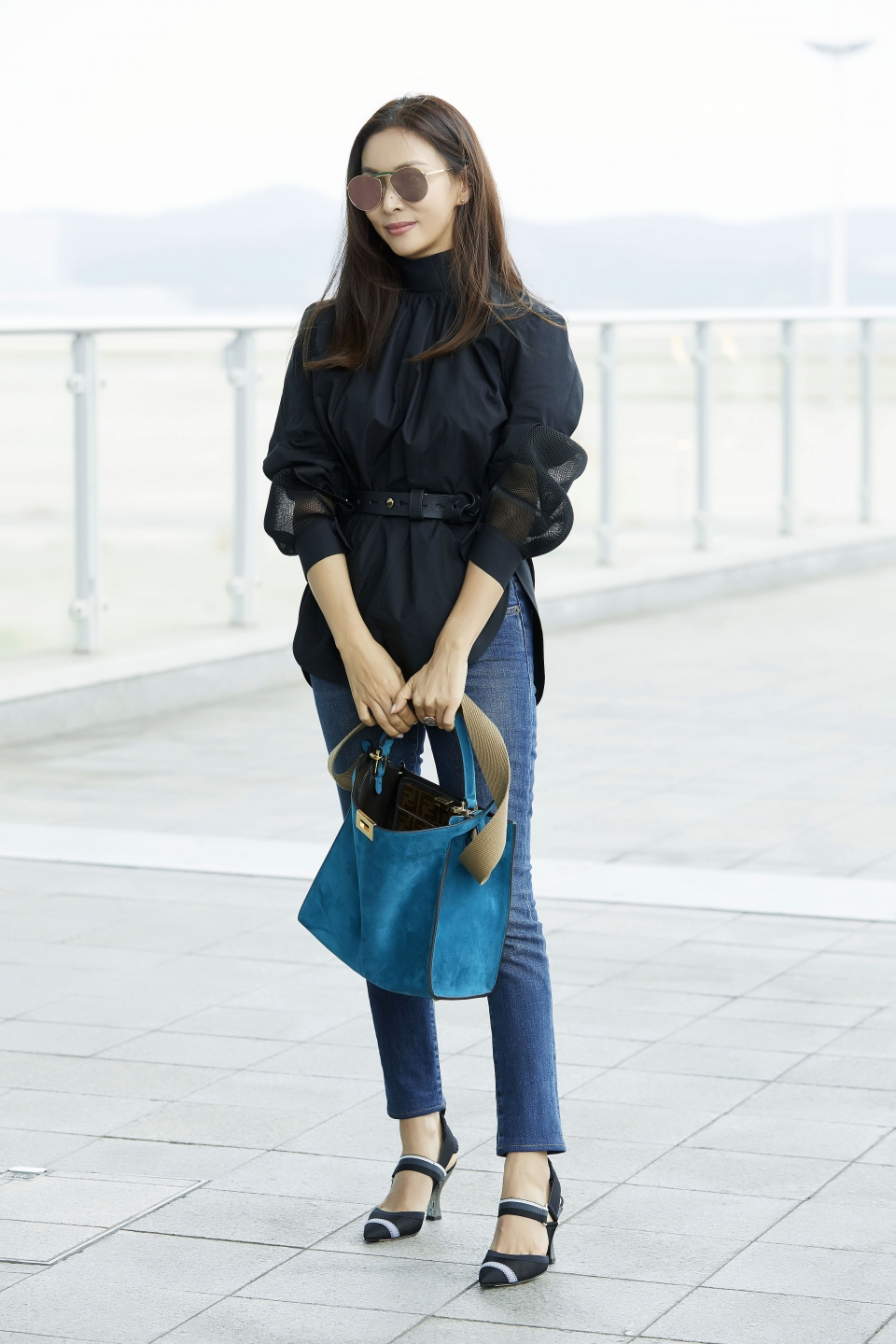 3일 이탈리아 브랜드 펜디(FENDI)의 쿠튀르 쇼 참석 차 인천국제공항 제2 여객 터미널을 통해 로마로 출국한 고소영은 원조 패션 아이콘다운 공항패션을 선보였다.