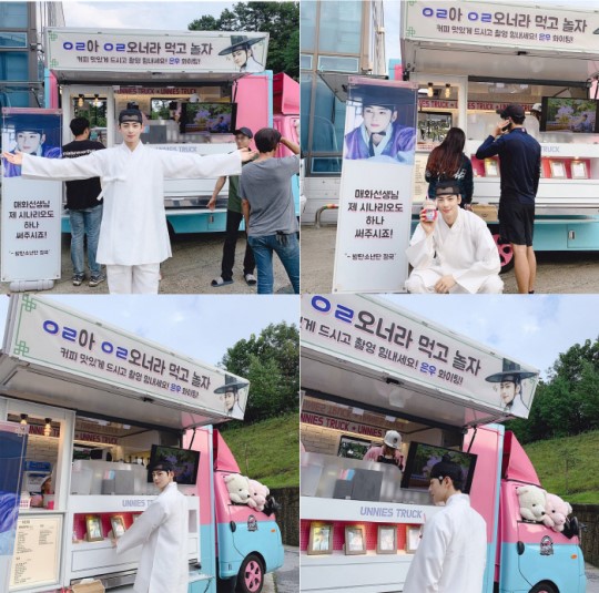 간식차 간판에는 "ㅇㄹ아, ㅇㄹ 오너라 먹고 놀자" "커피 맛있게 드시고 촬영 힘내세요! 은우 화이팅!"이라고 적혀있다. 차은우가 정국이 선물한 커피를 들고 인증한 사진 옆에는 "매화 선생님 제 시나리오도 하나 써주시죠!-방탄소년단 정국"이라고 쓰여있다.