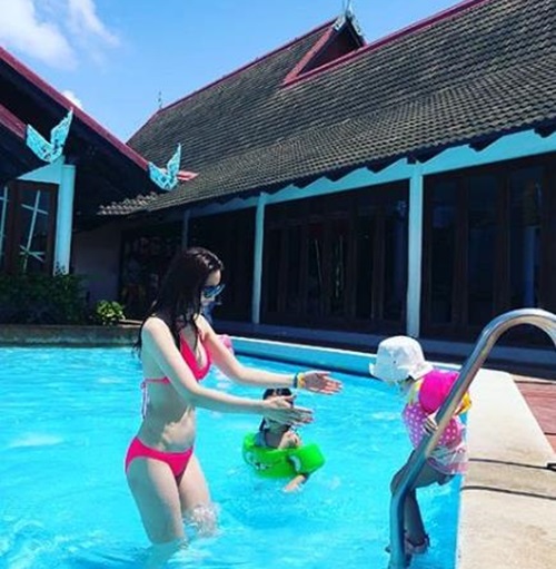 공개된 사진 속에는 휴양지의 한 수영장에서 딸과 물놀이를 즐기는 정가은의 모습이 담겨있다. 정가은은 핫핑크 비키니를 입고 딸을 보며 환하게 웃고 있다.