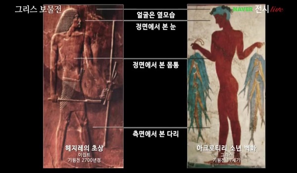 양정무 교수는 자신의 저서와 <그리스 보물전> 전시 라이브를 통해 그리스 미술은 이집트 미술의 영향을 받았다고 밝힌 바 있다. <그리스 보물전>에서 만나볼 수 있는 ‘아크로티리 소년 벽화’는 양정무 교수가 ‘차이나는 클라스’를 통해 소개한 이집트의 ‘정면성의 원리’를 잘 보여준다.