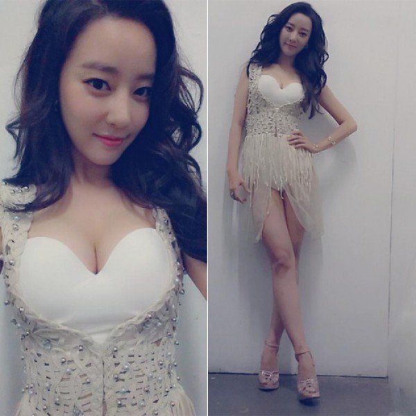 사진 속 고우리는 가슴 부분이 하얀색 하트 모양으로 강조된 윈피스 의상을 입고 있으며, 쭉 뻗은 각선미로 눈길을 끌었다.