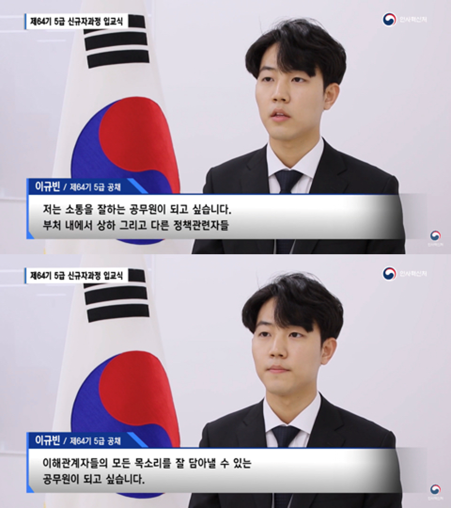 지난해 6월3일 대한민국 인사혁신처 유튜브 채널에 '미래를 품은 대한민국 사무관! 제 64기 5급 공채 입교식' 이라는 제목의 동영상이 최근 화제가 되고 있다. 동영상 속에는 64기 공채 사무관들의 입교식이 담겨 있었으며 그 중에는 이규빈의 영상도 담겨 눈길을 끌었다.