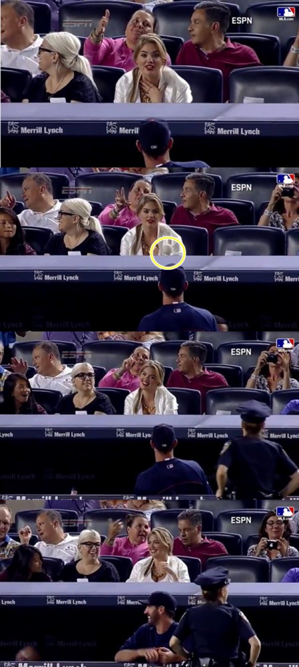 저스틴 벌렌더(31·디트로이트 타이거즈)가 경기 중 연인 케이트 업튼(22)에게 공을 주는 모습이 포착됐다.