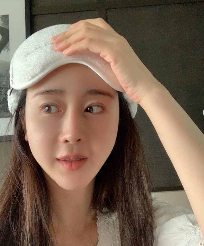 또 다른 사진에서는 안대를 한 채로 누워서 사진을 찍었다. 상의를 벗은 채 옆에 누워있던 남편 진화의 모습이 그대로 담겼는데도 그다지 아랑곳 없는 듯한 모습이었다.