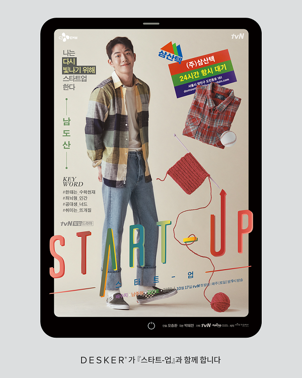 데스커 브랜드 론칭 이후 4년 만의 첫 전속모델이 된 배우 남주혁은 드라마 ‘스타트업’에서 다시 빛나기 위해 도전을 시작하는 좌뇌형 인물 ‘남도산’ 역을 맡아, 조금씩 변화하는 캐릭터를 디테일하게 표현하는 섬세한 연기력으로 호평 받고 있다. 극중 데스커는 책상 높이를 자유자재로 조절할 수 있는 ‘모션 데스크’를 비롯해 ‘콘센트형 테이블’, ‘컴퓨터 데스크’, ‘모니터 받침대’ 등 다양한 가구를 지원하고 있으며, 남도산이 수학 천재에서 스타트업 ‘삼산텍’ 창업자로 성장해나가는 과정과 함께한다.
