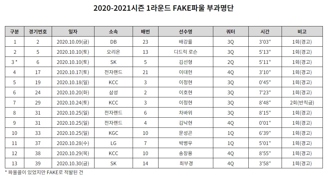 KBL이 4일 2020~2021 현대모비스 프로농구 1라운드 페이크파울 명단을 공개했다.