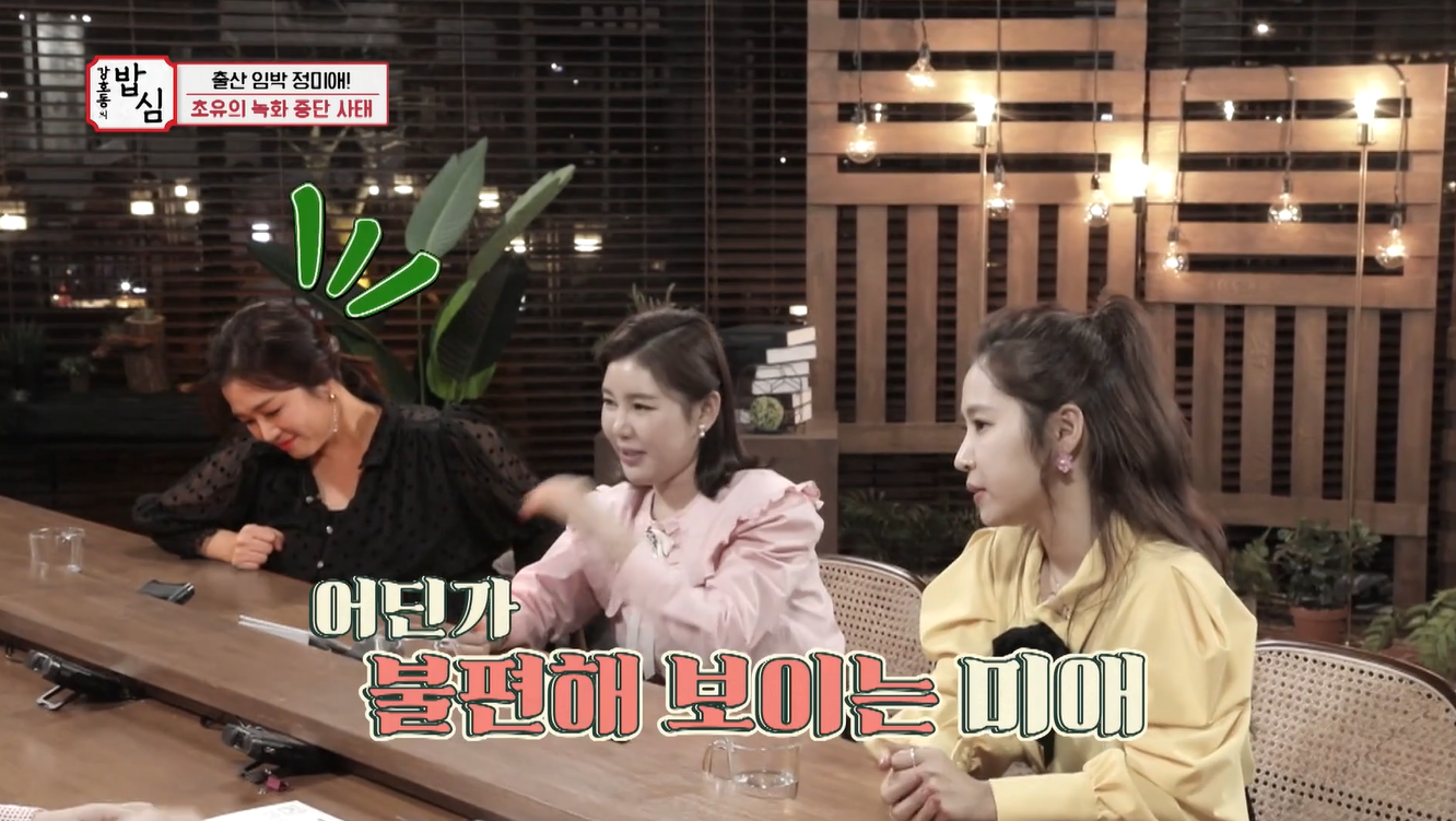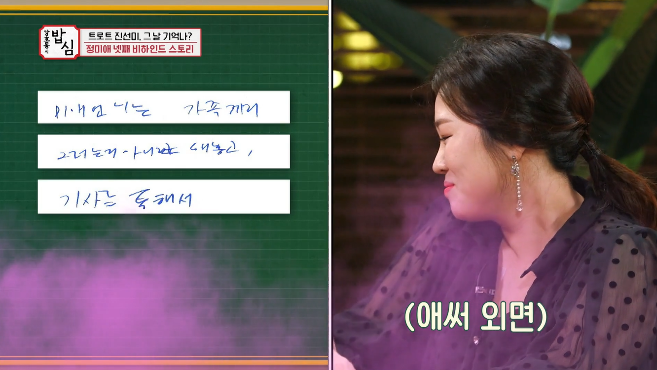 이날 방송에서 송가인 홍자가 무명시절 토크를 하던 도중 정미애의 얼굴이 심상치 않았다. 배를 잡고 고통을 견디는 듯한 표정에 MC 김신영이 "괜찮냐?"며 물었고 상황을 확인한 송가인은 "배가 좀 당기는 것같다"고 말했다.