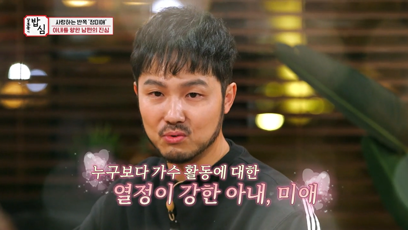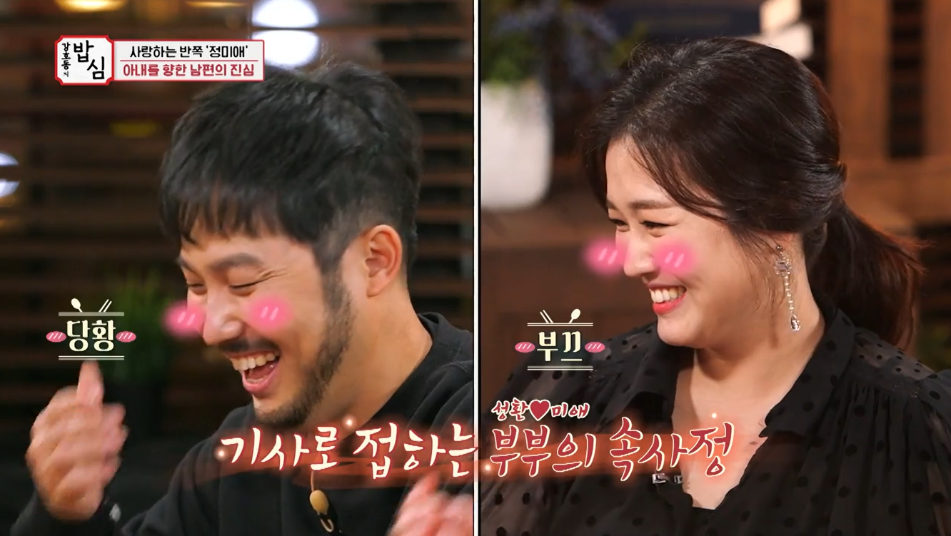 이날 녹화장에는 만삭의 아내를 보필하기 위해 정미애의 남편 조성환이 와있었다. 못말리는 금슬로 넷째까지 만든 남편이 소환돼 급 애정고백 시간을 가졌다. 강호동이 조성환에게 사랑고백 시간을 주자 정미애는 손사래를 치며 "쑥쓰러워서 우리는 서로 애칭도 안 쓴다. 저는 연애때 조금 썼는데 이 친구(남편)는 안 써봤다"라고 말했다.