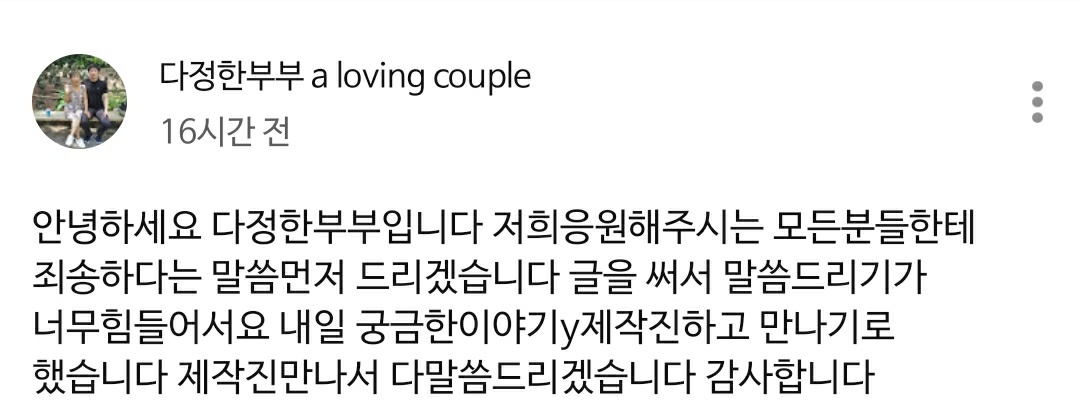 2일 오후 다정한 부부는 유튜브 커뮤니티에 "저희를 응원해 주시는 모든 분들에게 죄송하다는 말씀 먼저 드린다. 글로 말씀드리기 힘들다. 내일 SBS '궁금한 이야기Y' 제작진과 만나기로 했다. 만나서 다 말씀드리겠다"고 적었다.
