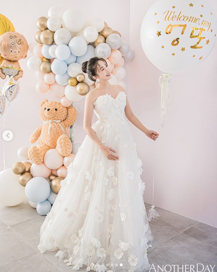 사진 뒤에는 아기의 태명인 '엉또'를 환영하는 풍선이 놓여있었다. 그는 "만삭촬영 했어요. 유난스러운 것같아 고민했지만, 결국 남는 건 사진 뿐이라. 나중에 엉또 크면 보여줄 추억 한 페이지. #이 안에 너 있다"라는 글로 설레는 마음을 전했다.