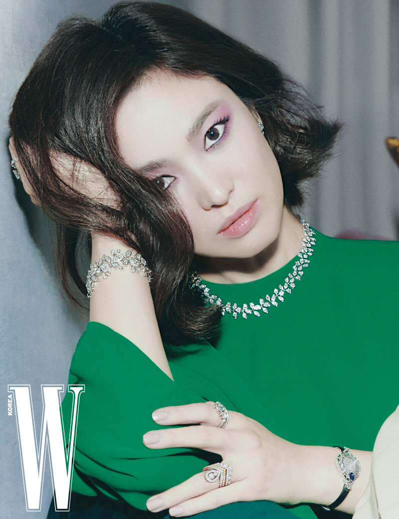 W코리아는 23일 송혜교의 화보와 인터뷰 '뉴 이어 뉴 미'(New Year, New Me)를 공개했다. 이번 화보는 주얼리 브랜드 쇼메와 함께 해 송혜교는 화려한 티아라와 반지, 팔찌와 목걸이, 귀걸이 등으로 변신했다.
