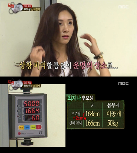 이날 지나는 실제 키와 몸무게를 최초공개했다. 지나의 실제 키는 166cm 몸무게 50kg이었다. 각종 포털사이트에 명시된 키에서 2cm만 줄었을 뿐 오차가 거의 없었다.