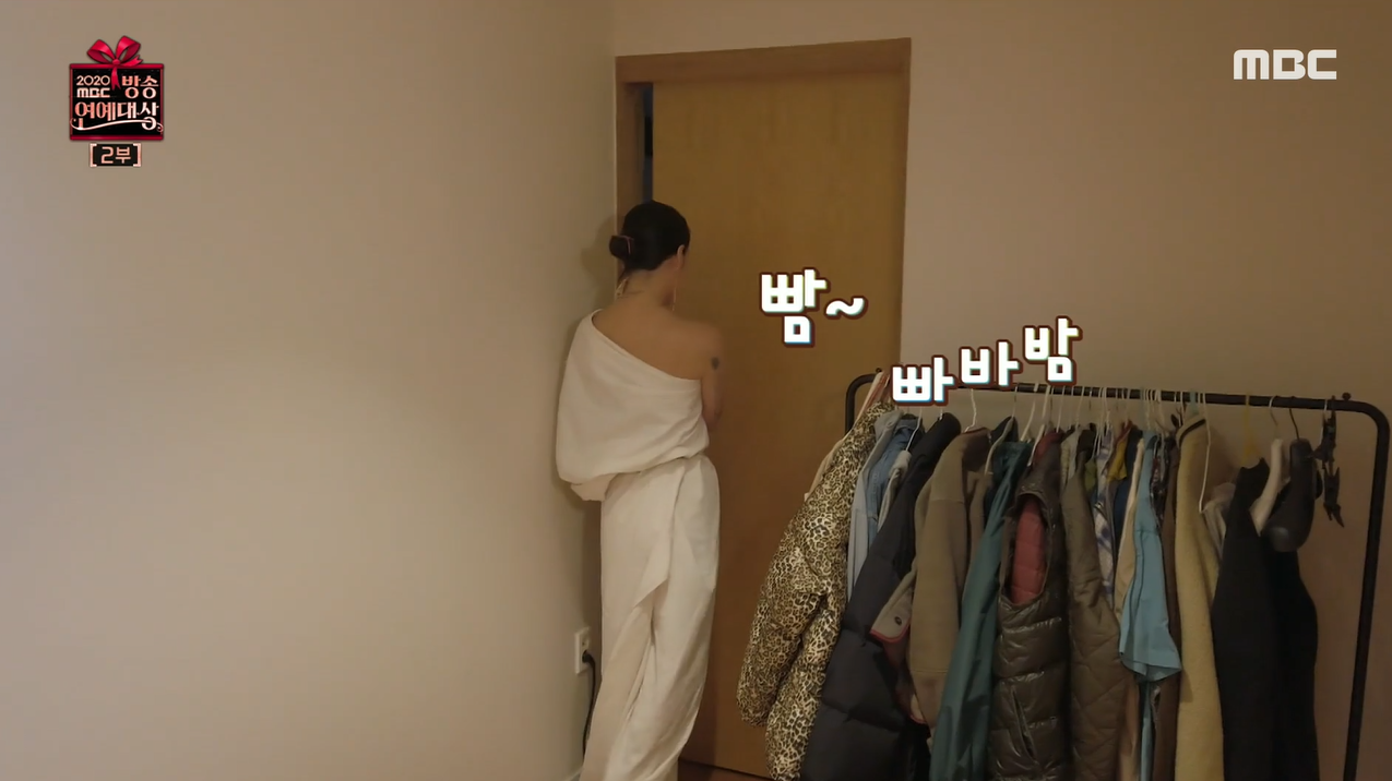가수 노사연과 유노윤호의 시상으로 '뮤직&토크 여자부문 최우수상'에 이효리가 호명된 가운데, 카메라는 제주도로 넘어갔다. 옷방으로 추정되는 공간에서 남편 이상순이 "효리야"하고 부르자 스스로 "빠바바밤 빠바~"라며 시상식 BGM을 노래하며 등장한 이효리는 이불 드레스에도 나름 블링블링 큰 귀걸이로 멋을 부린 모습이었다.