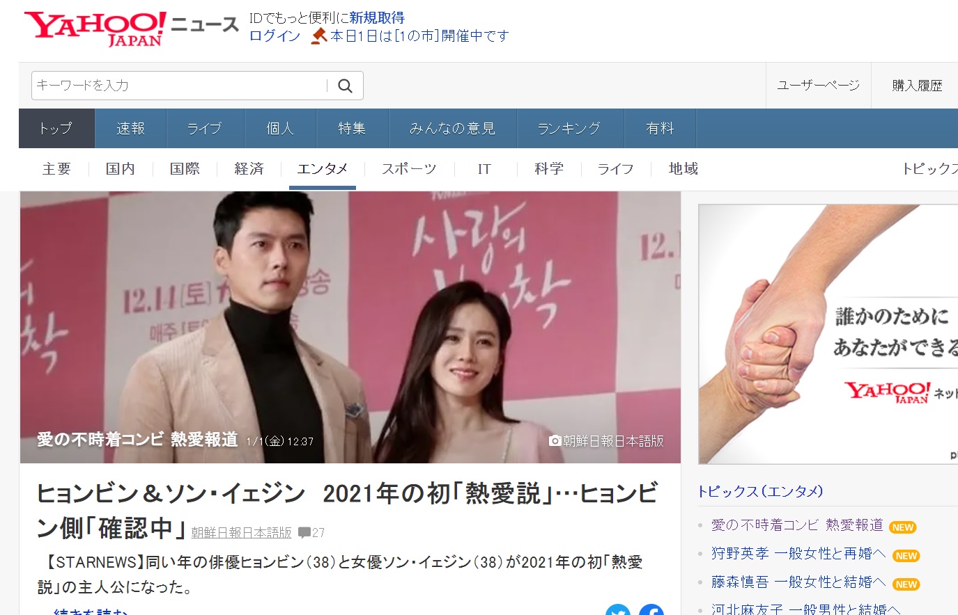[스포츠서울 박효실기자] 일본 넷플릭스에서 인기 1위를 기록하고, 일본을 강타한 2020년 '유행어'에 등극하기도 한 화제의 한류 드라마 '사랑의 불시착'의 현빈-손예진(38) 커플이 열애를 공식인정하면서 일본 열도가 들썩였다.