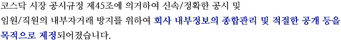제1조(목적) 이 규정은 「자본시장과 금융투자업에 관한 법률」(이하 “법”이라 한다) 및 제반 법규에 따른 신속․정확한 공시 및 임원․직원의 내부자거래 방지를 위하여 회사 내부정보의 종합관리 및 적절한 공개 등에 관한 사항을 정함을 목적으로 한다.제2조(용어의 정의) ① 이 규정에서 “내부정보”라 함은 한국거래소(이하 “거래소”라 한다)의 코스닥시장 공시규정(이하 “공시규정”이라 한다) 제1편에 의한 공시의무사항과 그 밖에 회사의 경영 또는 재산상황 등에 관한 것으로서 투자자의 투자판단에 영향을 미칠 수 있는 사항을 말한다.